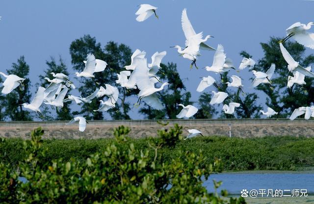 推荐理由:约3000亩红树林层层叠叠,郁郁苍苍,成群的白鹭、候鸟于其中或翩然起舞,或怡然休憩。