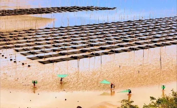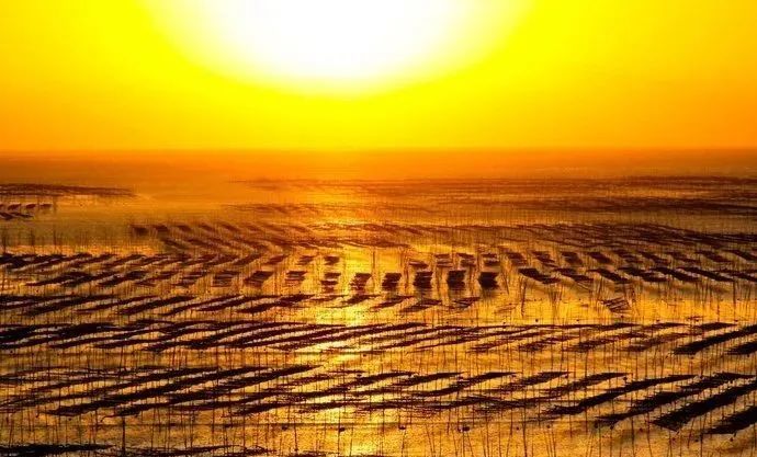 天与海的对话,幻化出最美的海滩。一只只高高的竹竿,静静的排列在淡墨色的海水上,或粗,或细,都在描绘着滩涂的极美。