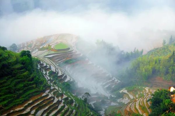弯弯的梯田,一层一层地依着山势螺纹般向上盘绕着,微风一吹,水面就荡漾着涟漪,把日光荡漾得像碎银子似的。