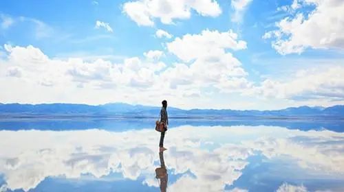 远处水与天已没有明显的界限。在这里,天是湖的一部分,湖是天的补充,似真似幻。