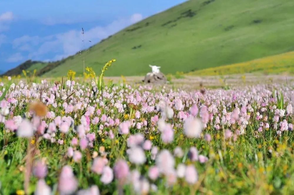 如果觉得极目之处都是油绿的草原过于单调,那么这片被五彩花海覆盖的草原,一定会让你迷醉在芬芳世界里。