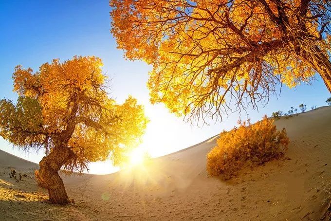 金秋的额济纳魅力尽显,在那一片蔚蓝的天空下与广袤的戈壁沙漠的衬托下,整个胡杨林如潮如汐、耀眼夺目。