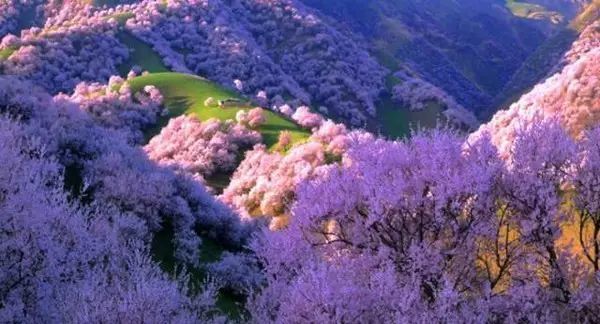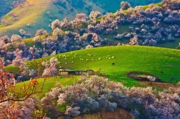 吐尔根野杏花盛开时,杏花香气醉人,整个半山均被野杏树覆盖,在初绿的背景下,被鲜嫩的、淡淡的粉色所渲染、即有大气磅礴的场面,又有形单影只的妩媚。