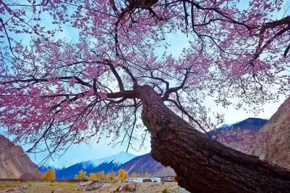 粉嫩的桃花,在气势磅礴的雪山怀抱中无限柔媚。繁花似锦的野桃林,映衬着湛蓝天空;洁白雪峰与碧玉般的尼洋河,美不胜收。