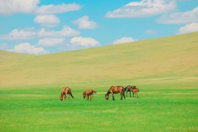 坦荡无垠的草原环抱着波光潋艳的呼和诺尔湖,草原绿茵如毯,鲜花烂漫,蒙古包点点,犹如绿海中的白帆。