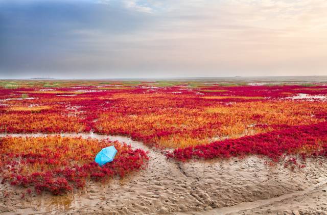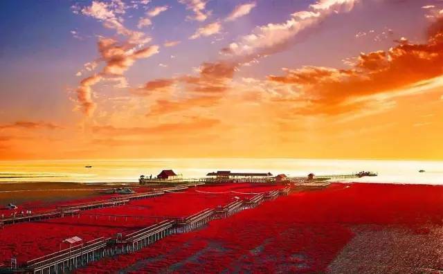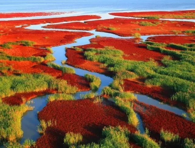 盘锦红海滩,像一幅巨大的猩红色地毯铺展在平阔的海滩上,远远望去层层叠叠,漫无尽头,蔚为壮观。