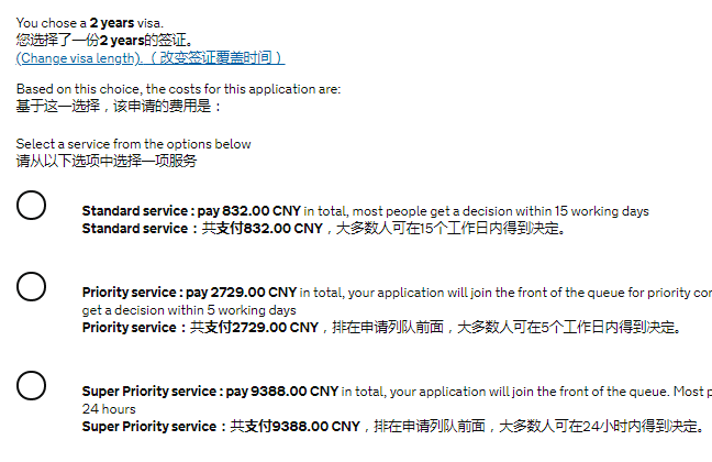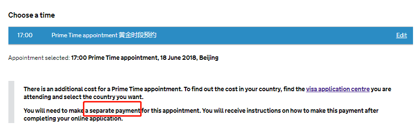 没有注意的人可能直接就下一步了(比如我),实际上英文的意思是,选用黄金时段需要额外付费,而费用根据每个签证中心的规定来收费,它不会在网上显示费用,而是你到了之后现场收费!而这个费用,可能接近2年签证费用的一半!(是的,我踩到了这个坑)