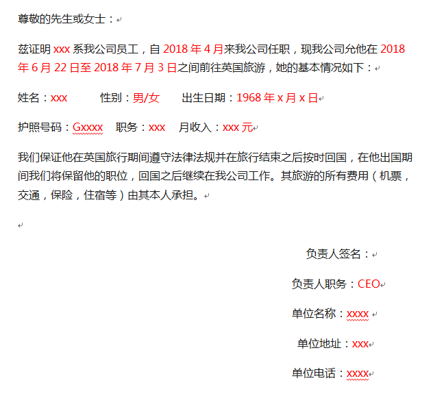 最好使用公司抬头纸打印,留下单位负责人真实电话,大使馆可能会电话至公司核实情况