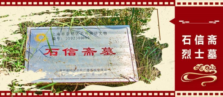 石信斋(1916-1941)三星海星村(今三星镇纯阳村)人,1940年起在“崇明县民众抗日自卫总队”任班长。1941年3月26日,石信斋在江苏海门桃园镇与敌作战中不幸牺牲,年仅25岁。石信斋牺牲后遗体葬于海门桃园镇,解放后其亲属将石信斋遗骨迁至家乡(今三星镇纯阳村)安葬并建墓地。墓地在村级道路边田野,占地16平方米,周边植4株龙柏。