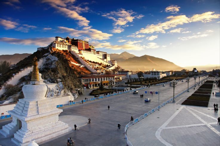布达拉宫依山垒砌,群楼重叠,是藏式古建筑的杰出代表,中华民族古建筑的精华之作,是第五套人民币50元纸币背面的风景图案。布达拉宫前辟有布达拉宫广场,是世界上海拔最高的城市广场。