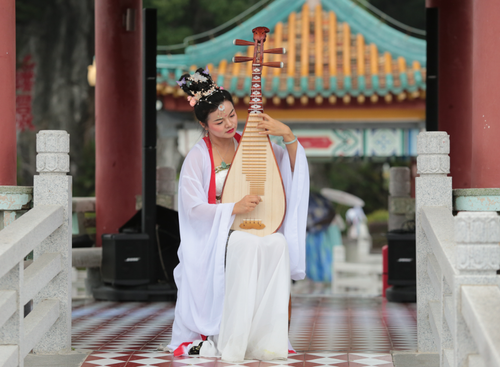 游客可以近距离观看端砚制作、花席编织、根雕雕刻、疍家糕制作等传统技艺的展示,在太阳岛、荫梓岗观光楼独具古色古香的亭台楼阁前,还有中国传统服饰、国风汉服的古装穿越活动,共同领略汉服的华美与乐趣。