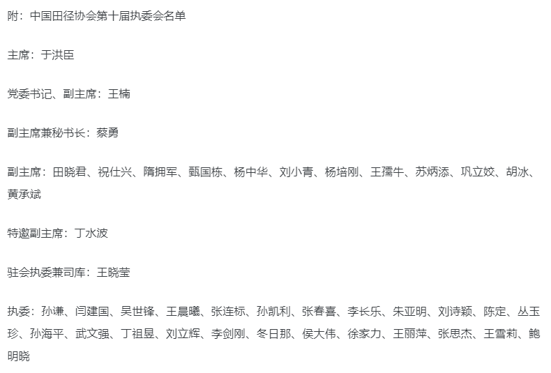 中国田径协会公布的第十届执委会名单中,主席为于洪臣;党委书记、副主席为王楠;副主席兼秘书长为蔡勇。此外,副主席还有12人,其中包括苏炳添、巩立姣。