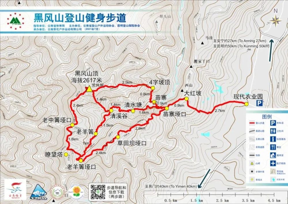 8:00-9:30,昆明拓东体育馆自驾至安宁市现代农业产业园起点,行程78公里,需1.3小时。停车上卫生间,查看步道地图,了解登山须知,出发。