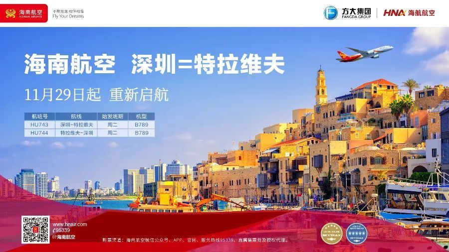 今年是中以建交30周年,海南航空计划于11月29日起复航深圳-特拉维夫直飞国际航线,这将是疫情以来中国大陆第一条复航的以色列直达航线,将再次搭建起中国与以色列两国之间友好互通的空中桥梁。该航线将采用波音787豪华宽体客机执飞,班期为每周二往返一班。(来源:海南航空)