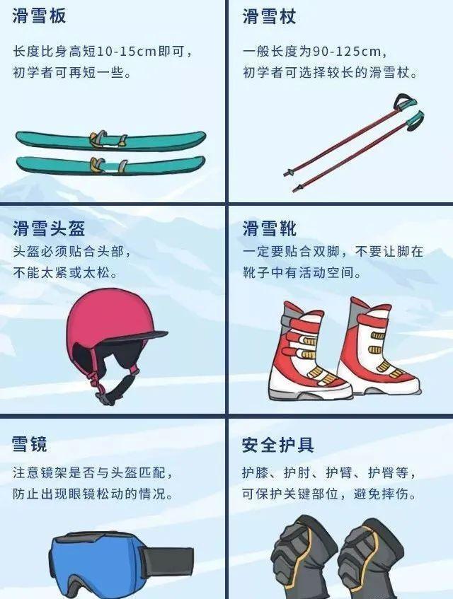 1.滑雪前,不仅要挑选适合自己的滑雪装备,还要充分活动颈、肩、腰、膝等关节,做好热身。