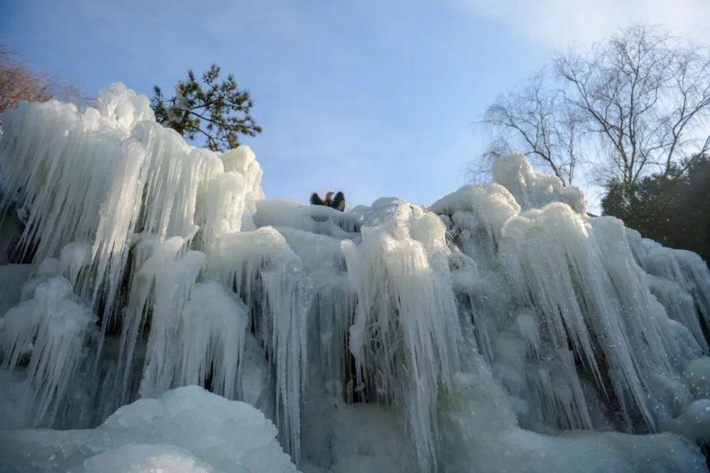 入冬后,九如山的瀑布一改往日的潺潺流水,慢慢流水成冰,凝结成玉带自崖壁倾泻而下,形成近百米高的绝美冰瀑。