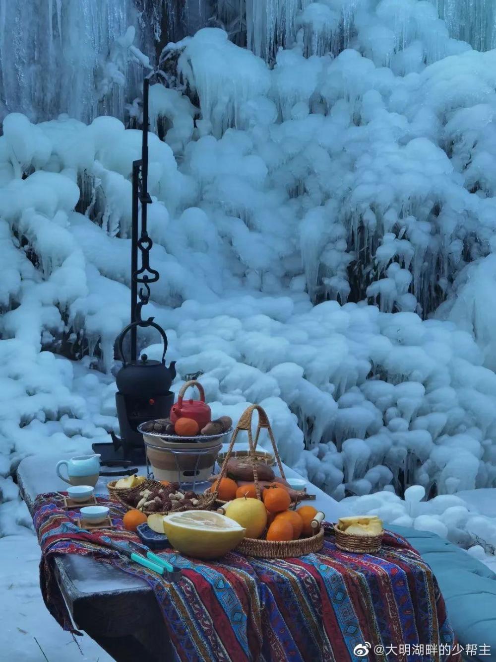 恋一处美景,约三五好友,在唯美的冰瀑下“围炉煮茶”,梦幻的童话里便有了人间的烟火气息。