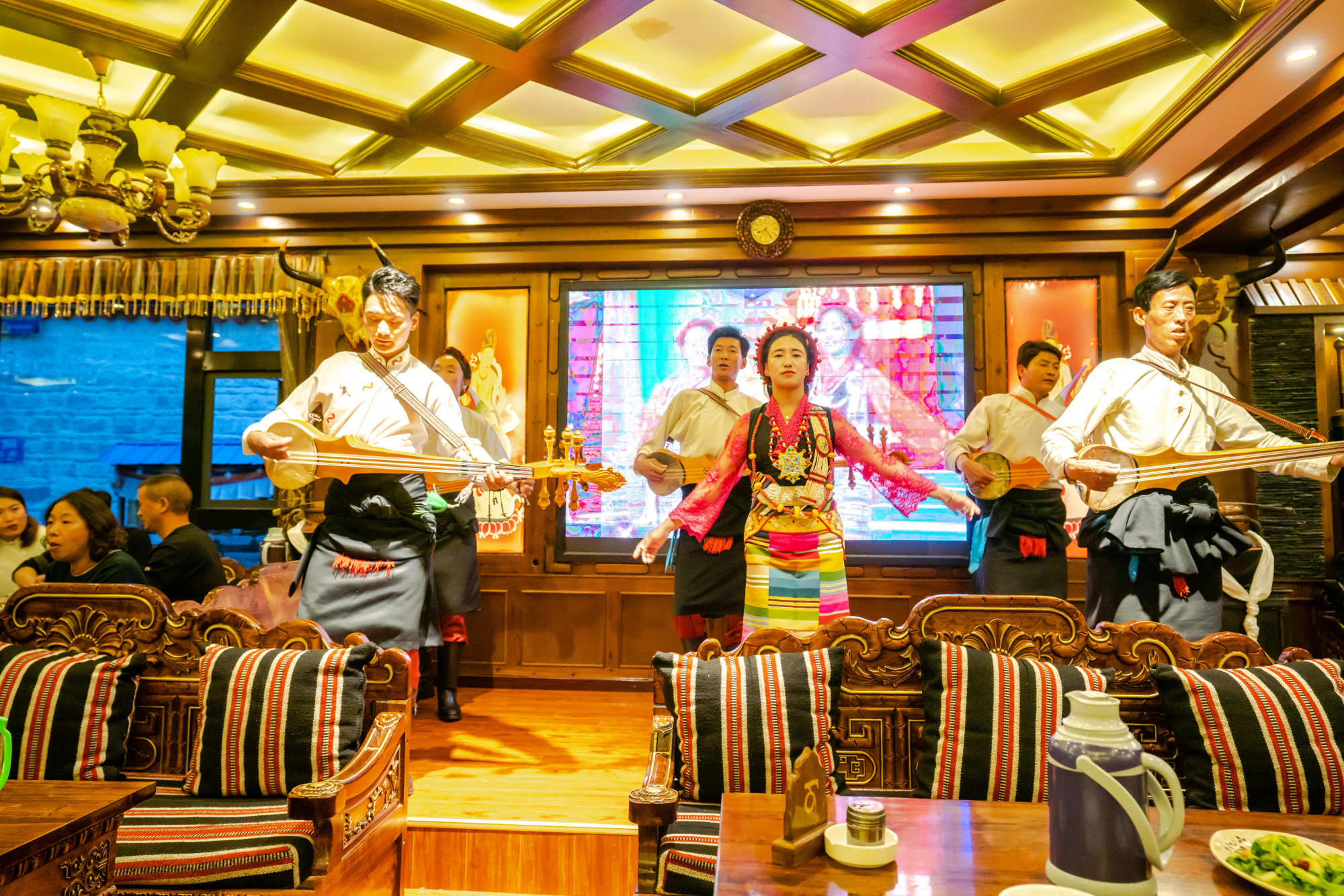 他们家的菜品主要有“扎西德勒”、冰川牛肉、椒盐牛舌、生牛肉配糌粑,吉祥羊头、康巴汉子等,每一道菜都是独特的高原美食;其次还有热情的民族风俗表演,载歌载舞中让人身临其境感厚重的藏族宫廷氛围,据说藏式的宫廷宴席是西藏接待客人的最高礼遇。