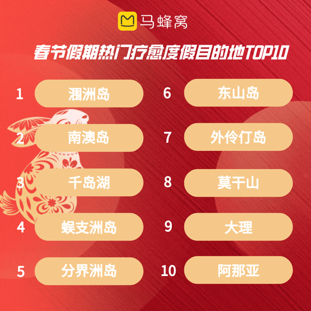 马蜂窝大数据显示,近一周以来,“春节去哪”相关热度上涨达172%, “海岛”、“温泉”、“民宿”成为春节假期热度最高的三大关键词。