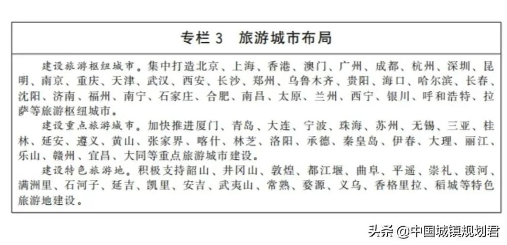 建设旅游枢纽城市(共34座城市):集中打造北京、上海、香港、澳门、广州、成都、杭州、深圳、昆明、南京、重庆、天津、武汉、西安、长沙、郑州、乌鲁木齐、贵阳、海口、哈尔滨、长春、沈阳、济南、福州、南宁、石家庄、合肥、南昌、太原、兰州、西宁、银川、呼和浩特、拉萨等旅游枢纽城市。城镇规划君分析了一下,几乎所有的直辖市、特别行政区和省会城市、自治区首府城市都被纳入了(除了我国台湾省省会台北市),除此之外只有计划单列市深圳市被纳入其中,而其他的4个计划单列市(青岛市、大连市、厦门市、宁波市)和普通地级市一个都没有入列。