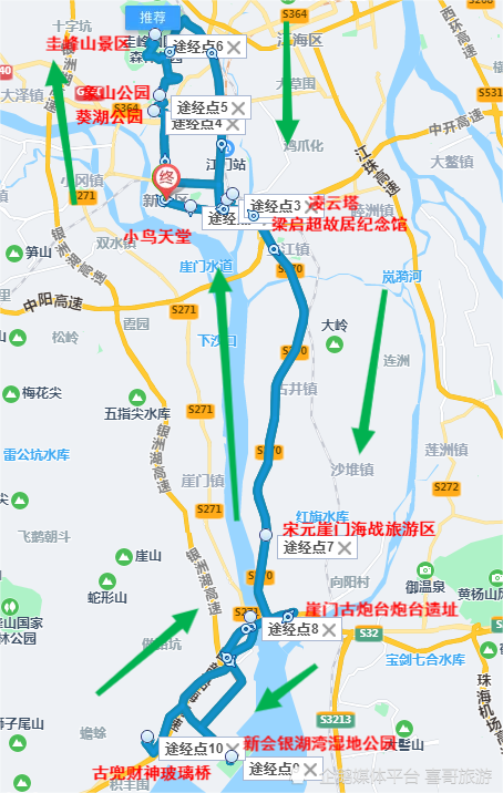 2、推荐新会区景点自驾游行程路线:新会区-小鸟天堂-梁启超故居纪念馆-新会凌云塔-葵湖公园-江门象山公园-圭峰山景区-宋元崖门海战文化旅游区-崖门古炮台炮台遗址-新会银湖湾湿地公园-古兜财神玻璃桥-新会区。