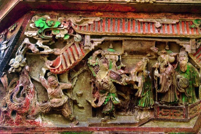 它呈“一”字形布局,仿木石质结构,四柱三开间,三重檐歇山式顶,面阔4.8米,高8米,上面用浮雕形式塑6条腾云祥龙,14幅戏剧人物,以及栩栩如生的花木、动物等图案。