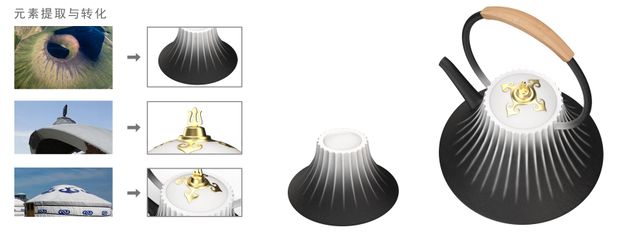 设计理念:这是以乌兰哈达火山地质公园里的火山为元素而设计的一套文创茶具,并取景于冬日雪景下的乌兰哈达火山。除此之外产品还融合了蒙古包与当地特色建筑的一些元素,不仅使产品具有了地域特色,还增加了产品的美感。通过这样的设计可以体现出乌兰察布丰富的自然资源和热情好客的本土风情,标志性的外观赋予了产品纪念意义。