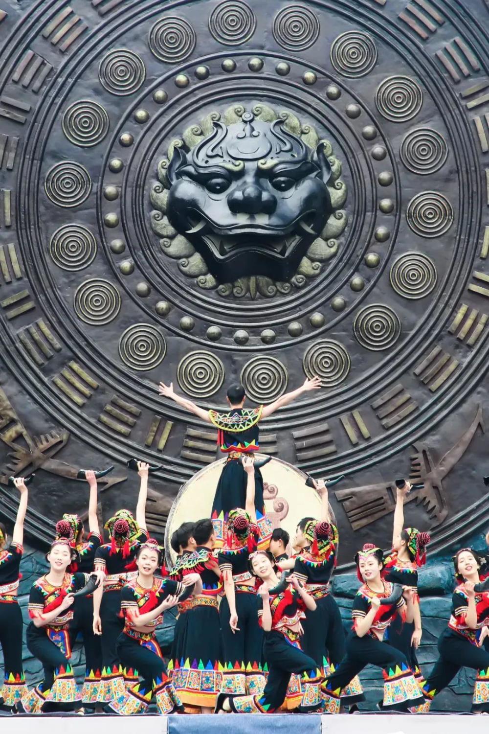 瑶望千年广场中央是一块露天舞台,舞台上以铜鼓牛角为背景,四周花坛绿草相衬,似在召唤远去的瑶胞回家团聚,击鼓而歌。