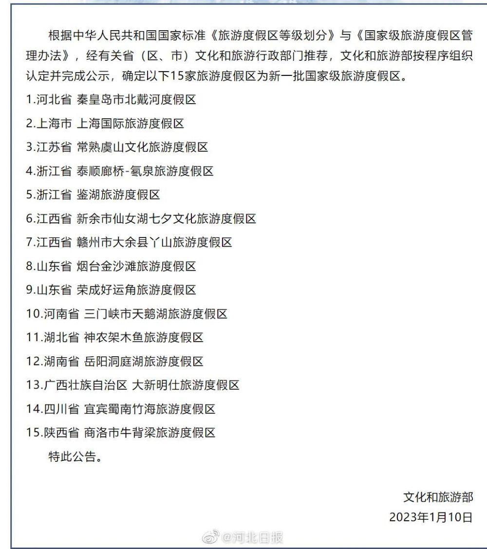 根据中华人民共和国国家标准《旅游度假区等级划分》与《国家级旅游度假区管理办法》,经有关省(区、市)文化和旅游行政部门推荐,文化和旅游部按程序组织认定并完成公示,确定15家旅游度假区为新一批国家级旅游度假区。河北省秦皇岛市北戴河度假区入选。(文旅之声)