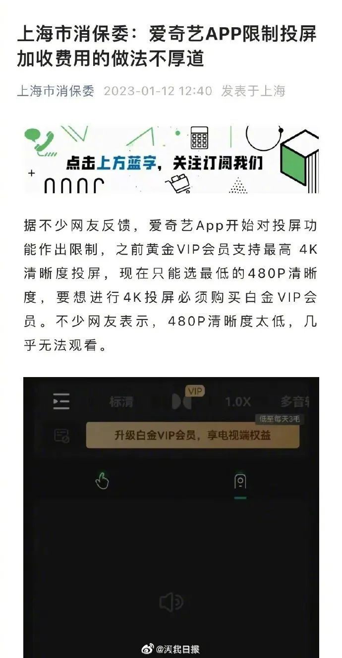 上海市消保委发文提醒视频平台:套娃式充会员薅消费者羊毛做法要不得。投屏是移动端用户正常的使用场景,消费者付了钱,在手机上看还是投屏看都是消费者的权利。平台在APP内限制消费者投屏的做法不合理,想用这种方法加收费用更不厚道。视频平台更无权不当获取手机权限干涉消费者采用第三方APP或者连线等方式投屏。(@人民日报)