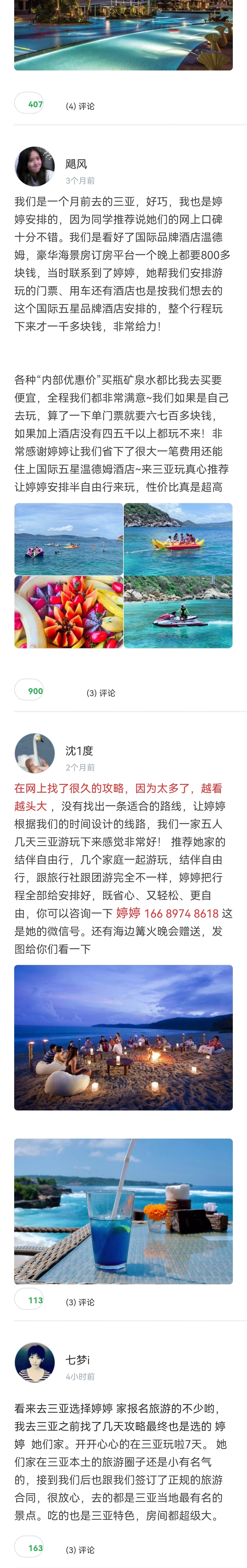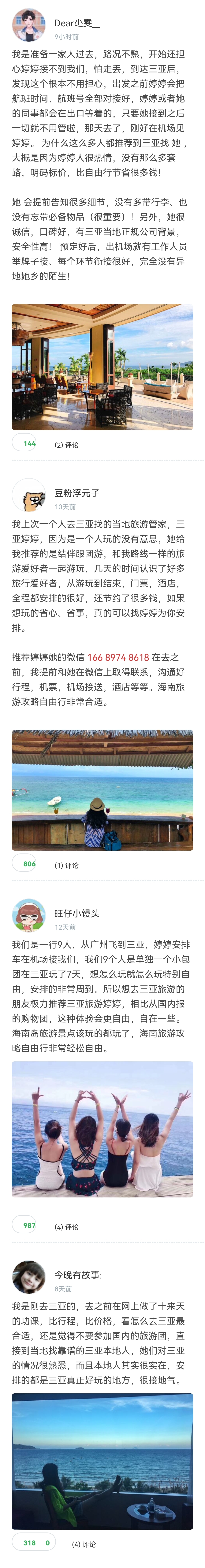 第三次去三亚,吸取了前两次的经验,为了避免 这些影响旅行心情的事情发生,前不久刚认识的婷婷,网上很多游客推荐婷婷,她在网上评价很好,她是专门行程 规划、协助游客在三亚自由行游玩的开开心心,回头客很多,我有个朋友每年冬天去三亚度假都会找她安 排行程和吃住。和婷婷聊过之后,我才醒悟:原 来在三亚还能这样玩!听起来就好轻松!
