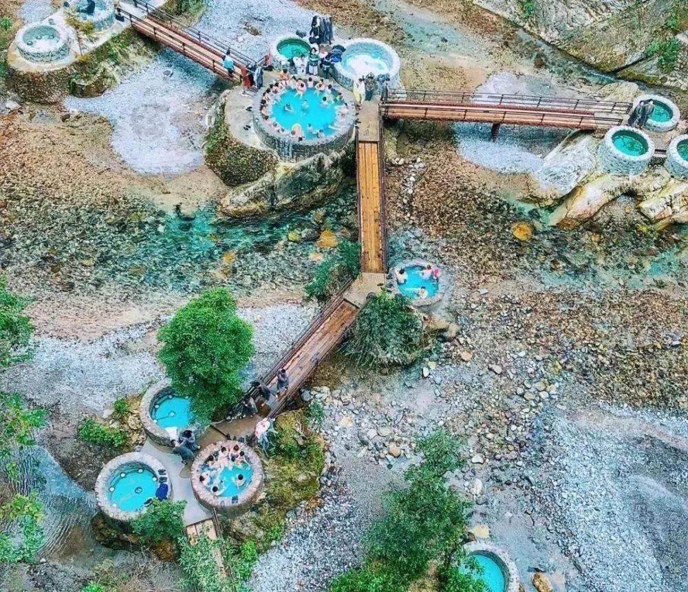 当你步入景区,便可见莹白的泉水从半山悬崖处跌落,似美人的水袖缱绻于青山松柏间,形成一处处形态不一的瀑布。此处的瀑布也是温泉,可观可泡。