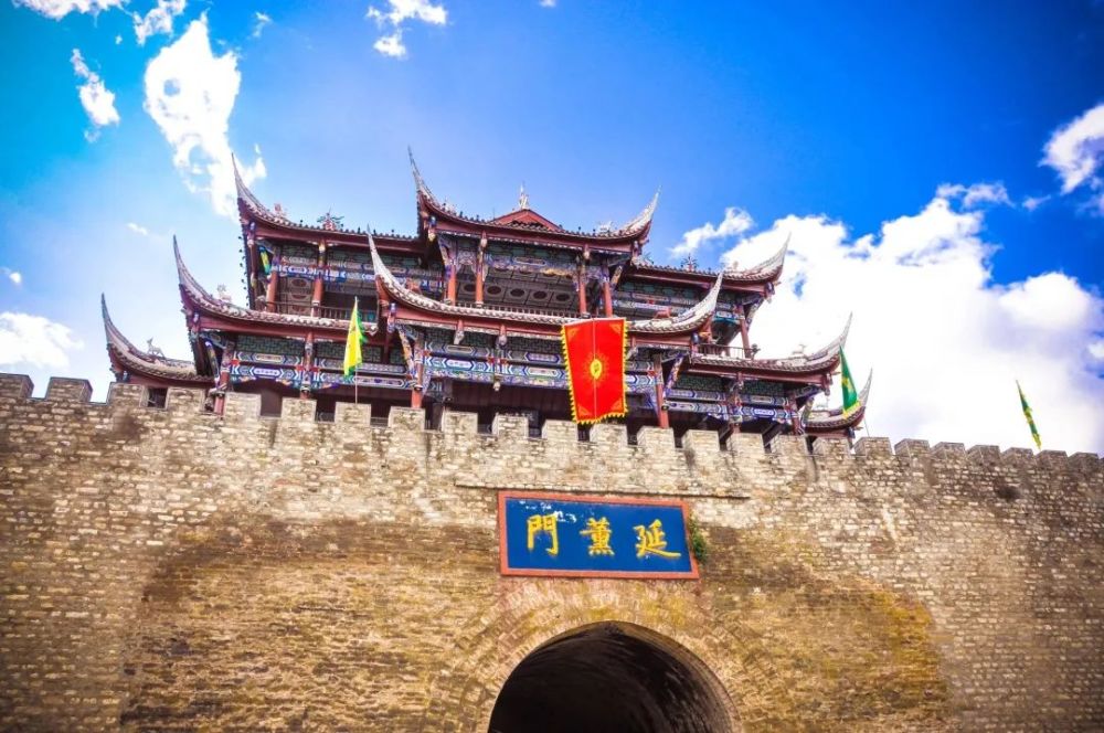 松潘古城位于四川省阿坝州松潘县进安镇,松潘古城分内、外两城,内城平面跨崇山,依山顺势略呈三角形,东部崇山之下河谷部份为长方形,外城毗邻内城南面的河谷下坝,有城门与内城相通,平面为长方形。城墙总长6.2公里,用本地烧制的青砖砌成墙身,内土石而成,高12.5米,厚12余米,以糯米、石灰、桐油熬制的灰浆粕连勾缝,坚固如铜墙铁壁。各城门仅以大块规则的长方条石券拱而成。松潘古城规模宏伟,气势非凡,其城墙的长度、高度、厚度、浮雕石刻的精美在民族地区是首屈一指的省级文物保护单位。