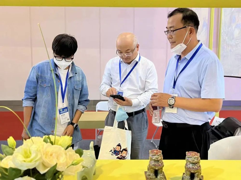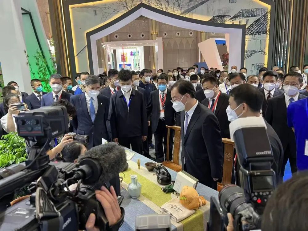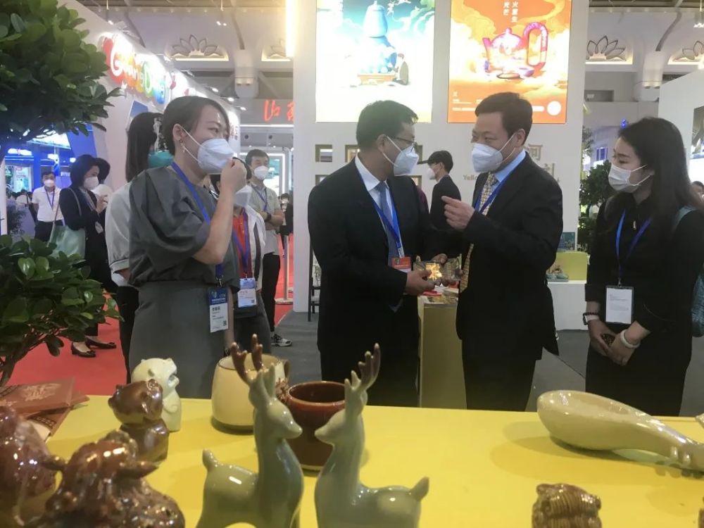 河南省政府副秘书长黄东升、河南省文化和旅游厅副厅长李延庆到“许昌礼物”展区参观,文投公司详细讲解了博物馆馆藏文物的文创衍生品钧瓷辟邪杯,这也是2022款馆藏文物文创产品的首秀。