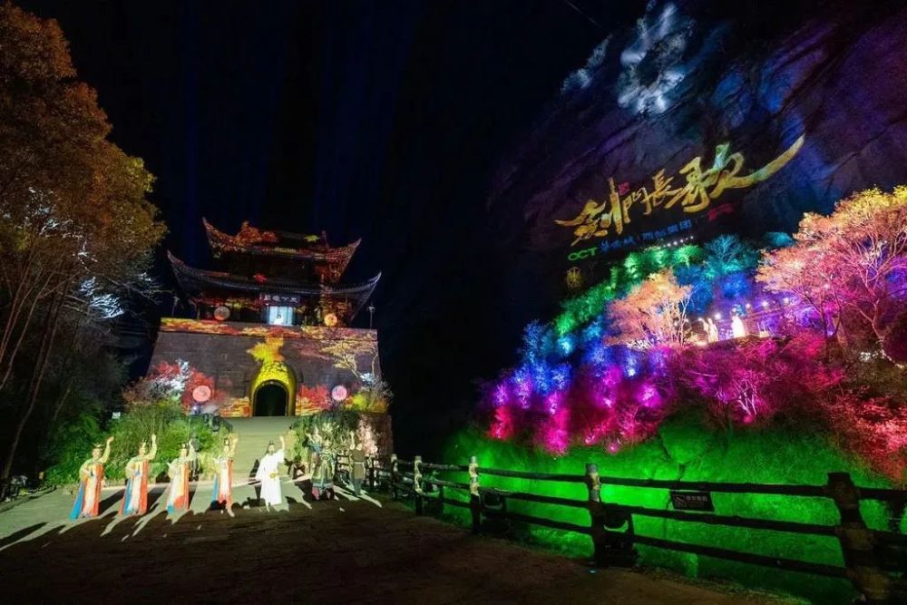 崖壁灯光演艺秀《剑门长歌》,穿越2400年的剑门蜀道风云沉浮,体验1公里的极致沉浸,开启一场全新的可视、可听、可互动等多重感官体验夜游盛宴。