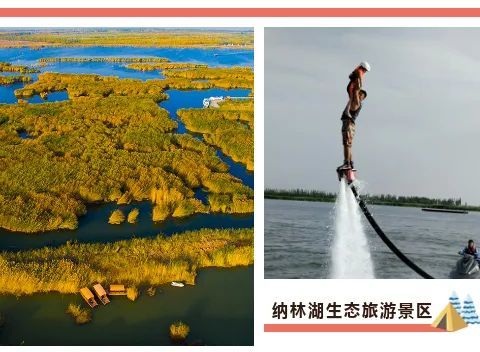 纳林湖是写在乌兰布和沙漠中的一抹诗意。这里湖水凝碧、苇丛团簇、珍鸟云集、鱼翔浅底,形成了沙漠中的一大奇观。景区开展沙雕观赏、湖面荡舟、水上飞伞、滑草滑沙、水上飞鱼、坐快艇、骑马乘驼、冲浪、滑索等众多娱乐项目。