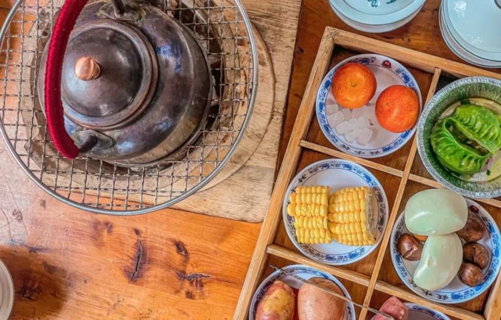 大名鼎鼎的鹤鸣茶社坐落于成都人民公园内,它是成都最老的传统茶馆之一,而现在,这座百年茶铺也上新了围炉煮茶。一个陶罐一张铁网烤盘,茶壶、栗子、柿子、杂粮……从里到外摆开。炉里炭火烧得正旺,烤架上的玉米、红薯等散发出丝丝香味,三五好友围坐于温暖的烤炉前,直接把冬日仪式感拉满。