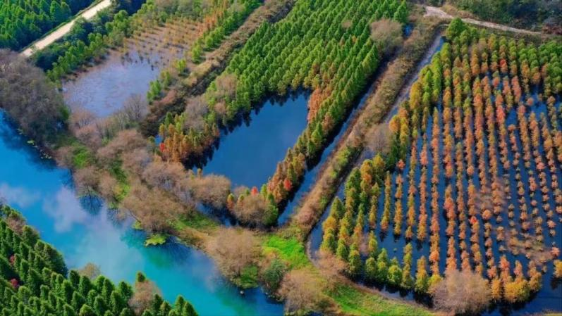 初冬时节,昆明市盘龙区滇源街道甸尾村湿地内的水杉林渐次换上“红妆”,红色、橙色以及尚未褪却的绿色将整个湿地装点得绚烂斑斓。
