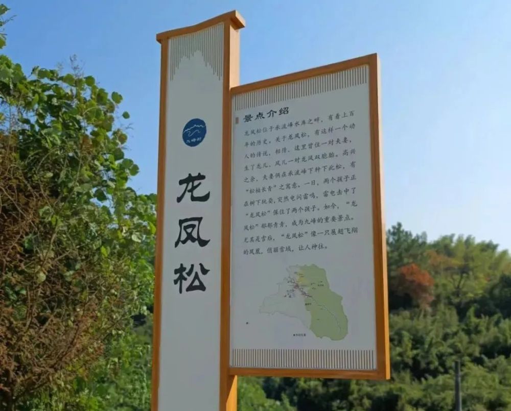 在九峰村落外围的承流峰水库旁,有两株马尾松相依而生,根部相连,高低起伏,似游龙戏凤,被当地群众称为“龙凤松”,它历尽磨难仍然生机勃勃,是我们中华民族不屈不挠、欣欣向荣的民族精神的象征。