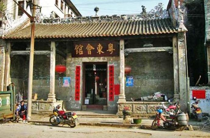 粤东会馆:位于广西梧州市龙圩区龙圩镇忠义街。建于清康熙五十三年(1714年),乾隆五十三年(1788年)重建,会馆面积1373平方米,砖木结构,分前、中、后3座和更楼(更楼在解放前已拆),中、后座深宽各8米,屋檐层为元宝脊。每座由4根大木柱和2根大石柱支撑,叠梁式构架,雕梁画栋,有较高的建筑艺术。1994年定为自治区文物保护单位。