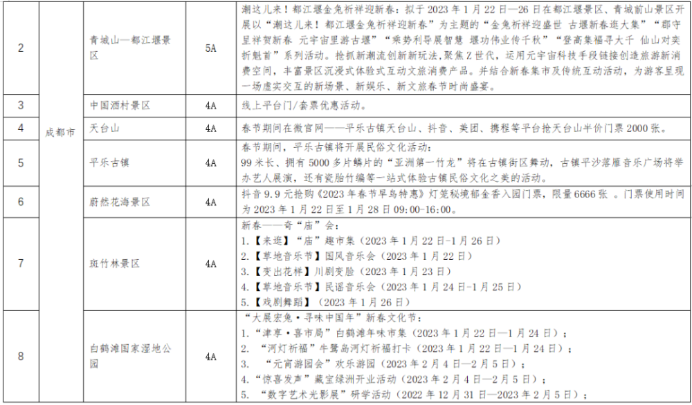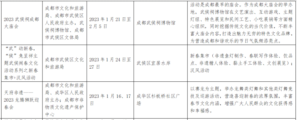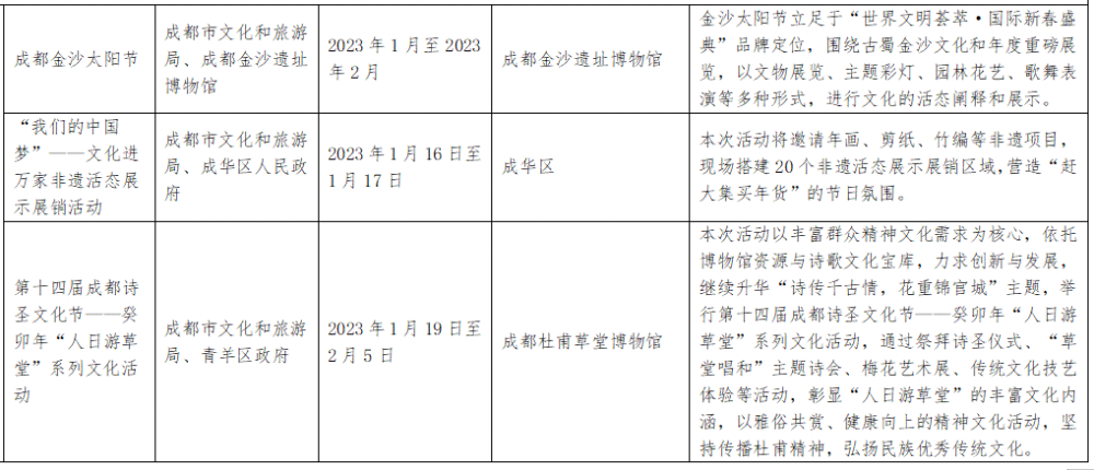 成都将推出成都金沙太阳节、2023武侯祠成都大庙会、第十四届成都诗圣文化节——癸卯年“人日游草堂”等系列文化活动;攀枝花市将推出非遗过大年、第十四届米易灯展等重点文旅活动,其他市(州)也将推出体现各自文化特色的文旅活动。