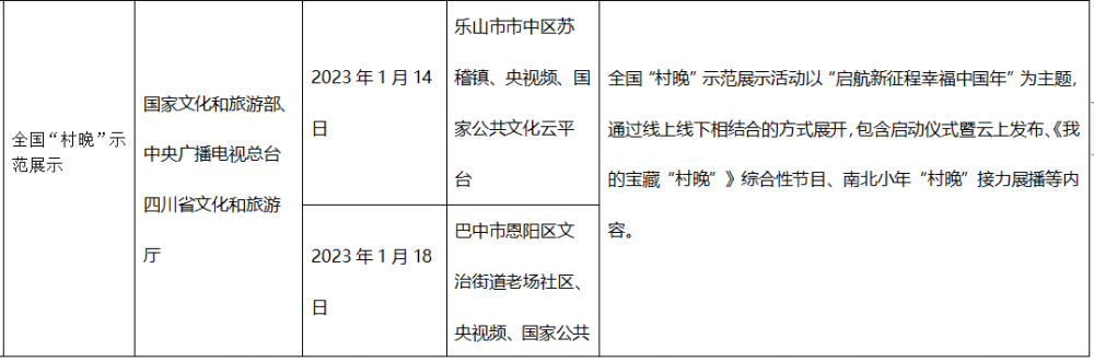 包括全国“村晚”示范展示、第29届自贡国际恐龙灯会、高山仰止 回望东坡——苏轼主题展等重点文旅活动。
