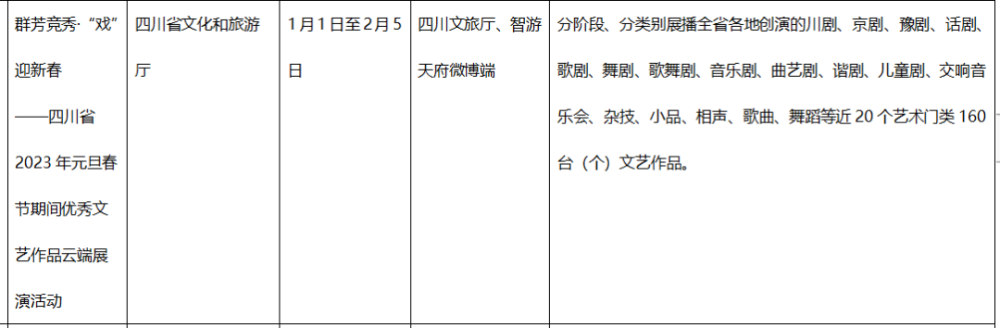 全省文艺院团还将采取线上线下相结合的方式,组织开展210余场文艺展演活动,内容涵盖川剧、舞剧、话剧、歌曲、舞蹈等近20个艺术门类约2000台(个)文艺作品。还将陆续推出灯会、庙会、巡游、舞龙舞狮、祈福、展览、集市等民俗活动。