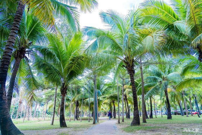 三亚湾椰梦长廊是围绕三亚湾建造的著名海滨景观大道,椰子树整齐地排列在路边,与海滩和海水形成一幅美妙的画面。