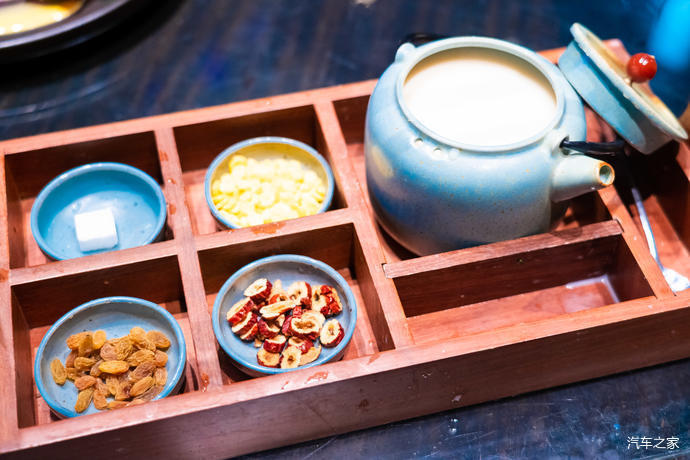 网红石磨养生豆浆,一个壶、四盘小菜,精致典雅、营养丰富,口感特别好,是餐厅必点的一道饮品。