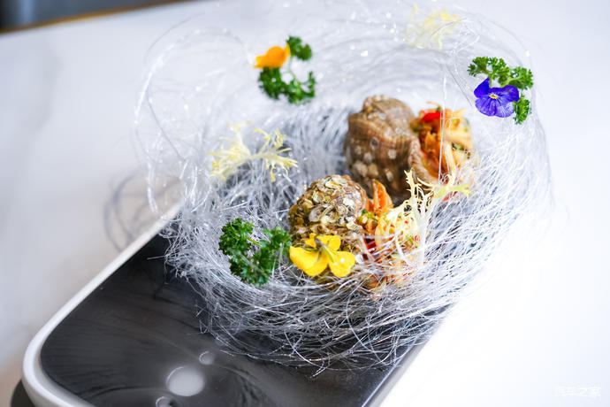 和风细柳牛油果芥末虾球,非常精致的摆盘,外面的糖丝包裹在了树枝上,形成了一个一米多高的糖树,放着就像一件艺术品,使人不舍得下筷,虾肉特别的鲜美,配上芥末的辛鲜,让这道菜回味无穷。
