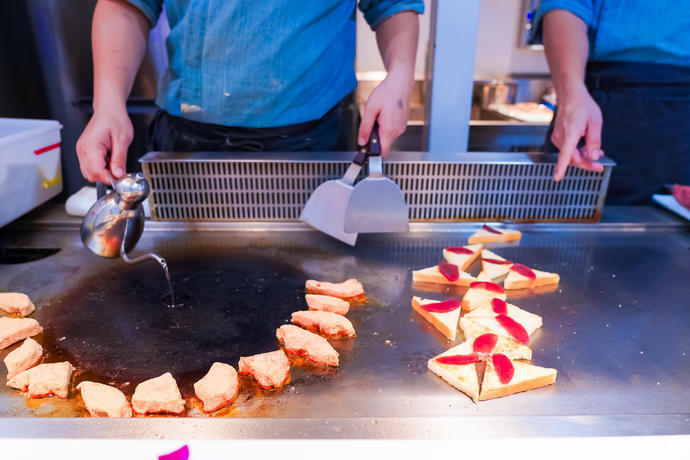 法式铁板烧,我的最爱,有香煎鹅肝、香草羊排、蒜香琵琶虾、澳洲和牛排、蒜香煎银雪鱼、白兰地香煎贝柱、阿根廷红虾等。