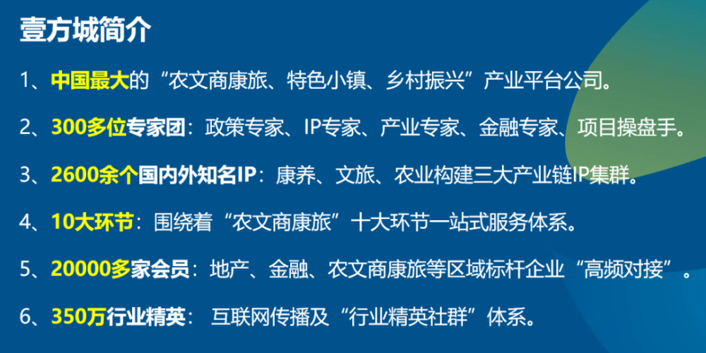 作为中国文旅/特色小镇全产业链一站式服务平台——壹方城,打造集康养/文旅产业顶层设计、投融资、拿地、策划、规划、申报、产业导入、建设、招商、运营10大环节的全产业链一站式服务模式。
