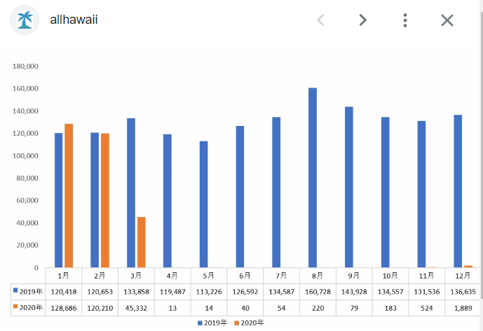 据美国夏威夷州观光局日本支局等机构发布的数据,2019年约有157万日本游客访问夏威夷。2020年疫情发生后,全年只有29.7万日本游客访问夏威夷,且主要集中在当年的1-3月,那时当地疫情还不严重,这之后游客数便急转直下,沦入数十到数百区间。