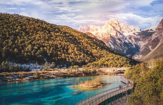 缆车只能到达海拔4506,于是我们带着氧气,顺着栈道步行到达最高处4680。站在栈道尽头的扶手边,深深地看着眼下一片苍茫大地,挥斥这会当凌绝顶,一览众山小的满心豪气。顶着雪山脉间猛烈地大风,只为看一眼山脚下的天池之水,蓝月谷。远远望去,如一汪汪凝固的蓝色明镜,碧蓝的沁人心脾。